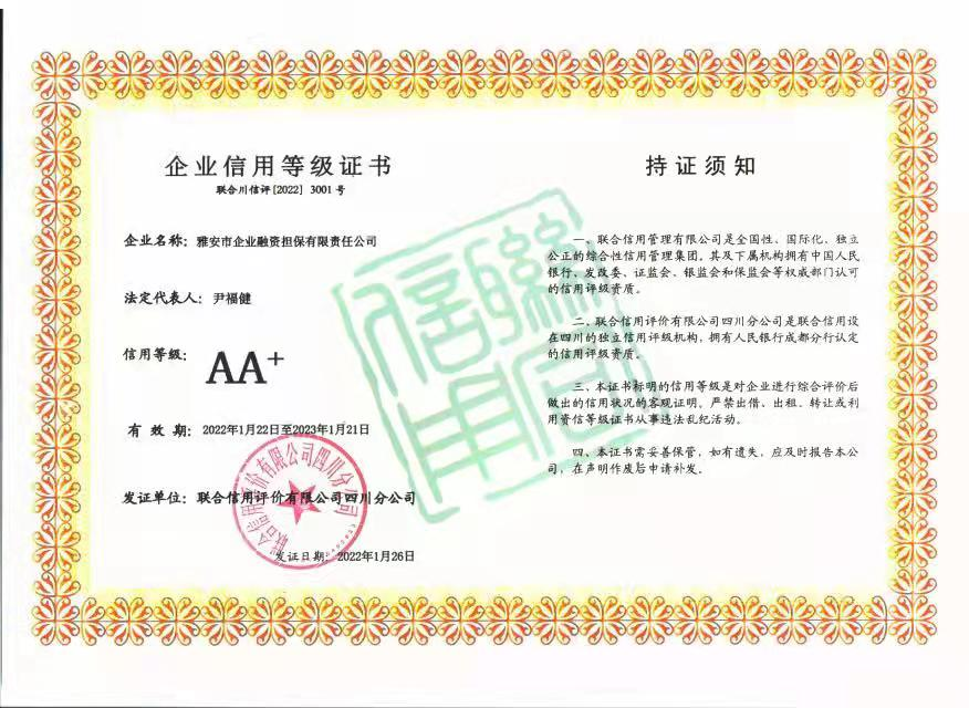 聯(lián)合信用評價有限公司是我國信用行業(yè)資質(zhì)最全、服務(wù)區(qū)域最廣,覆蓋規(guī)模最大的信用信息服務(wù)機(jī)構(gòu)之一。近期,該公司先后為四川省信用再擔(dān)保有限公司、成都市現(xiàn)代農(nóng)業(yè)融資擔(dān)保有限公司、瀘州市興瀘融資擔(dān)保集團(tuán)有限公司、眉山市眉州融資擔(dān)保有限公司等20余家川內(nèi)擔(dān)保機(jī)構(gòu)開展2022年度評級工作,共評出了兩家AA+擔(dān)保機(jī)構(gòu),其中就有雅安市擔(dān)保公司。